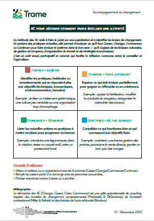 Cette fiche présente la méthode des 4C, utile pour faire le point sur une exploitation et identifier les leviers de changement. En partant des pratiques actuelles, elle permet d’analyser ce qu’il faut Cesser, Changer, Commencer ou Continuer pour faire évoluer le système dans le bon sens.