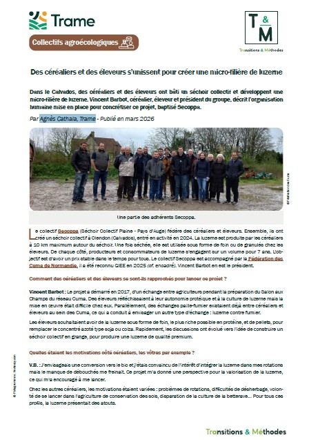 Le collectif Secoppa (Séchoir Collectif Plaine – Pays d’Auge) fédère des céréaliers et éleveurs. Ensemble, ils ont créé un séchoir collectif à Olendon (Calvados), entré en activité en 2024. La luzerne est produite par les céréaliers à 10 km maximum autour du séchoir. Une fois séchée, elle est utilisée sous forme de foin ou de granulés chez les éleveurs. De chaque côté, producteurs et consommateurs de luzerne s’engagent sur un volume pour 7 ans. L’objectif est d’avoir un prix stable dans le temps pour tous. Le collectif Secoppa est accompagné par la Fédération des Cuma de Normandie, il a été reconnu GIEE en 2025. Vincent Barbot en est le président.