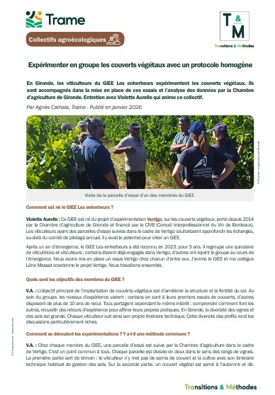 Après un an d’émergence, le GIEE Les enherbeurs a été reconnu en 2023, pour 3 ans. Il regroupe une quinzaine de viticultrices et viticulteurs : certains étaient déjà engagés dans Vertigo, d’autres ont rejoint le groupe au cours de l’émergence. Nous avons mis en place un essai Vertigo chez chacun d’entre eux. J’anime le GIEE et ma collègue Léna Masset coordonne le projet Vertigo. Nous travaillons ensemble… Téléchargez l’article pour en savoir plus.